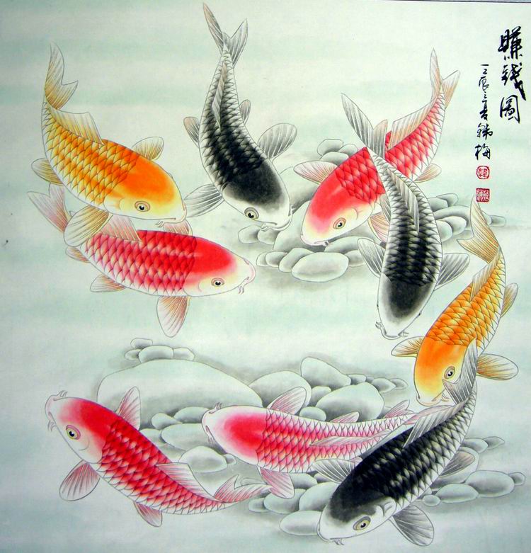 第一字画网的斗方九鱼图,这幅四尺斗方的九鱼作品适合挂在玄关、走道或是书房等不同场合,九鱼荷花寓意十分吉祥,如果放在画廊出售,韩梅老师此幅斗方九鱼图的标价在1800元左右。“鱼”与“余”谐音,鱼则象征着富贵,所以中国吉祥图案中常有鱼的图案。